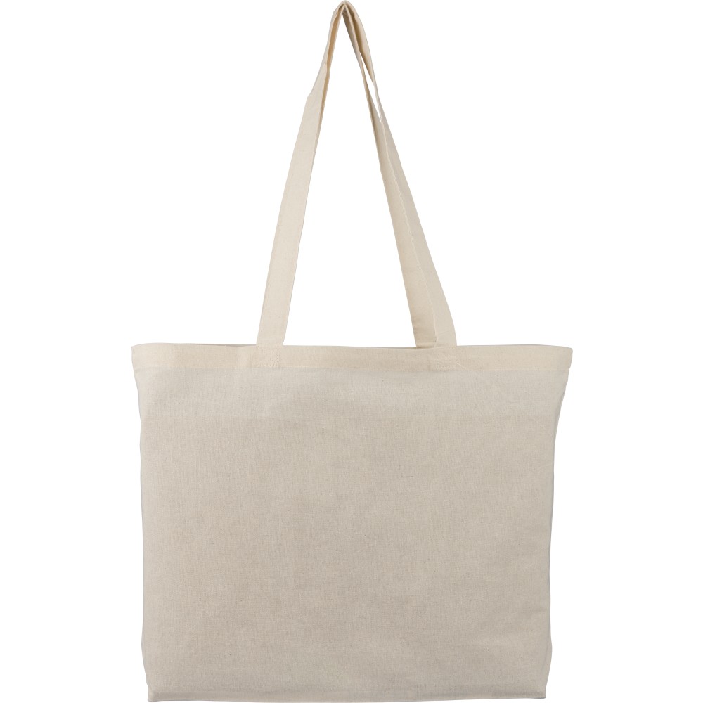Oeko-Tex minősítésű, 140 g/m2 pamutból készült natúr színű bevásárlótáska, 48 × 34 × 10 cm méretben, 70 cm hosszúságú és 2,5 cm szélességű fülekkel. Oeko-Tex címkével ellátva.