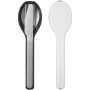 Ez az elegáns és praktikus Ellipse evőeszközkészlet egy kést, egy villát és egy kanalat tartalmaz, mindegyik rozsdamentes acélból készült. Az evőeszközök egy kompakt műanyag tartóban vannak. Mosogatógépben mosogatható.