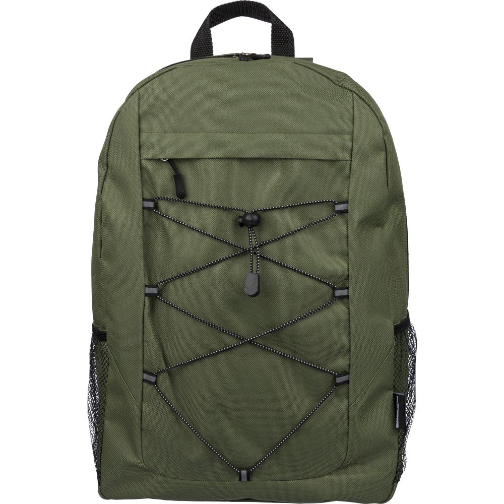 RPET poliészter 600D anyagból készült hátizsák húzózsinóros záródással és nagy cipzáras fő rekesszel. Hálós oldalzsebekkel, rugalmas elülső pántokkal, dekorációhoz kialakított kis elülső cipzáras zsebbel és állítható vállpántokkal rendelkezik. A terméken rPET alapanyagra utaló címke található.