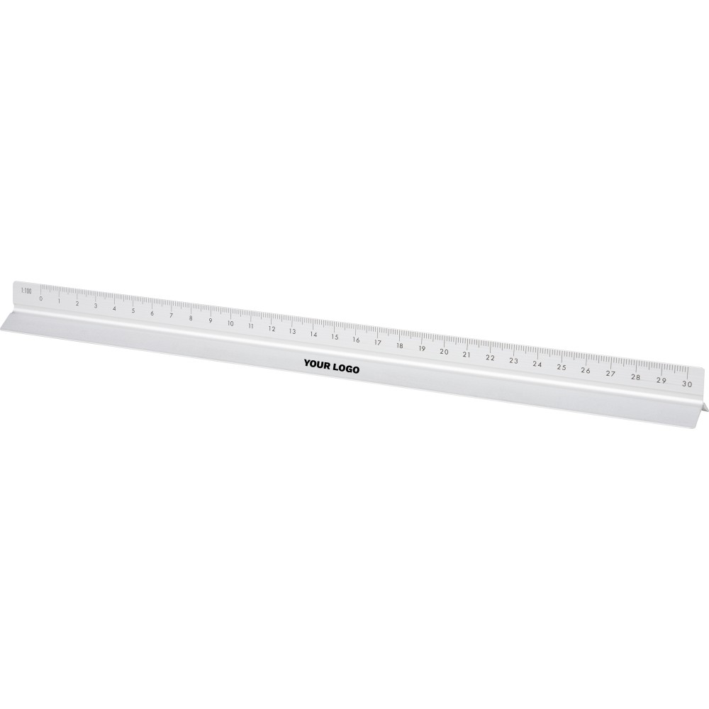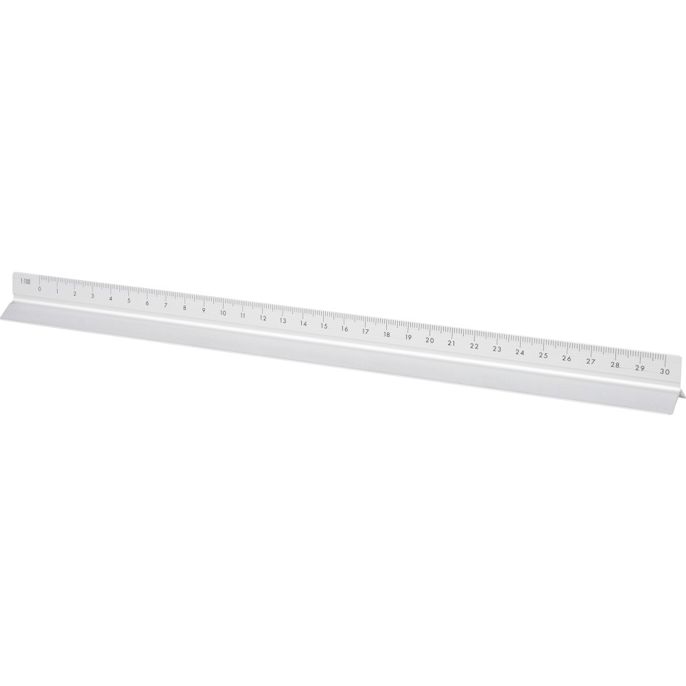 Alumíniumból készült, 30 cm hosszú háromszög alakú vonalzó több mérési léptékkel: 1:20, 1:25, 1:50, 1:75 és 1:100. Az egyik oldala skála nélküli gravírozási felületként használható. Centiméter és inch beosztással ellátva. Darabonként barna kartondobozba csomagolva.