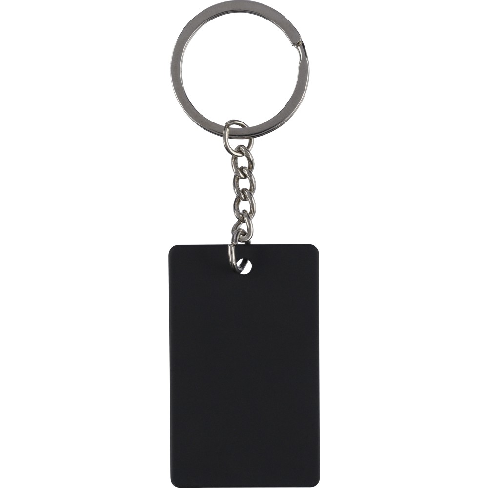 Újrahasznosított rozsdamentes acélból készült, gumírozott felületű, téglalap alakú kulcstartó fém karikával. A kulcstartón gravírozott recycled (újrahasznosított) alapanyagra utaló logó található, amely gravírozás után fényes, tükörszerű hatást mutat. Egyenként kraft papírtasakba csomagolva.