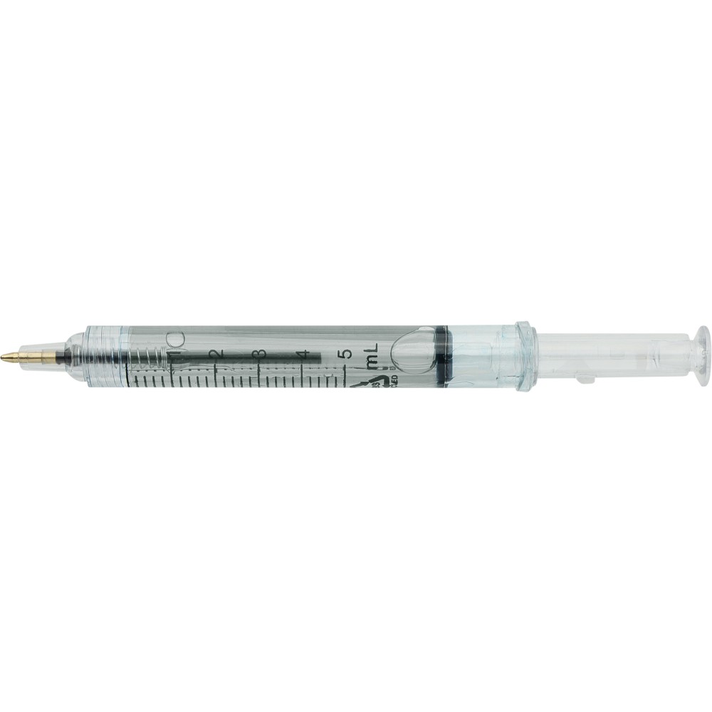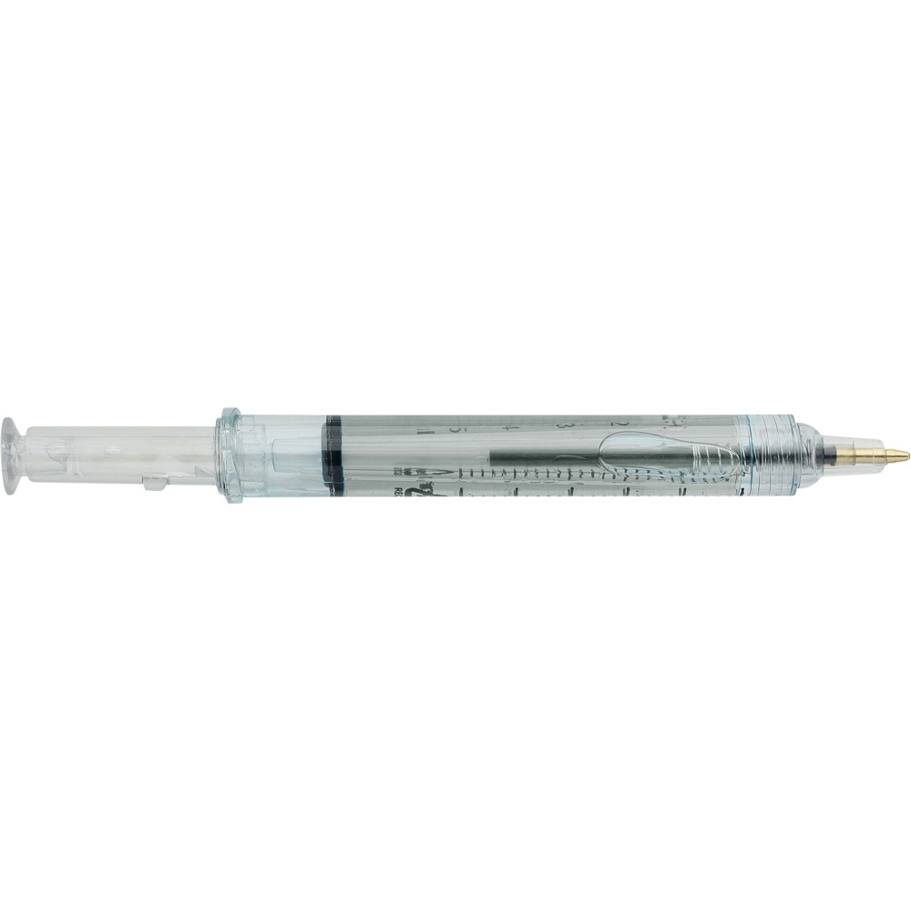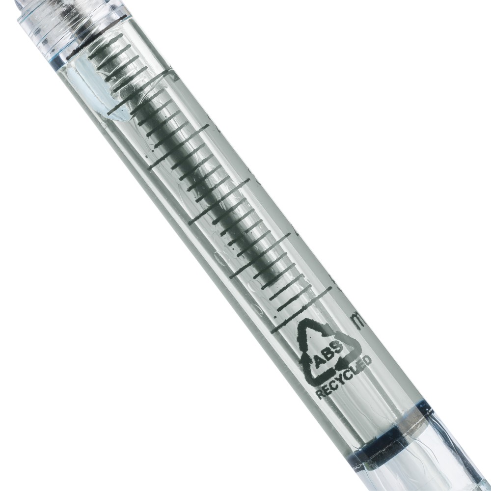 Színes folyadékkal töltött fecskendő alakú golyóstoll. Újrahasznosított ABS-ből készült, nyomógombos szerkezetű, fekete tollbetéttel szállítjuk. Érintőképernyőkhöz használható stylus véggel rendelkezik. In-mould (öntőformában elhelyezett) újrahasznosított ABS logóval díszítve.
