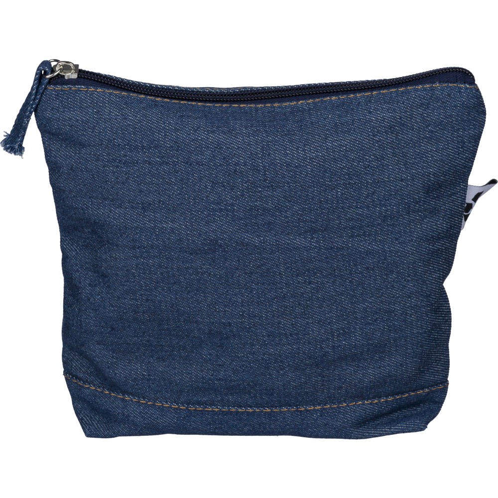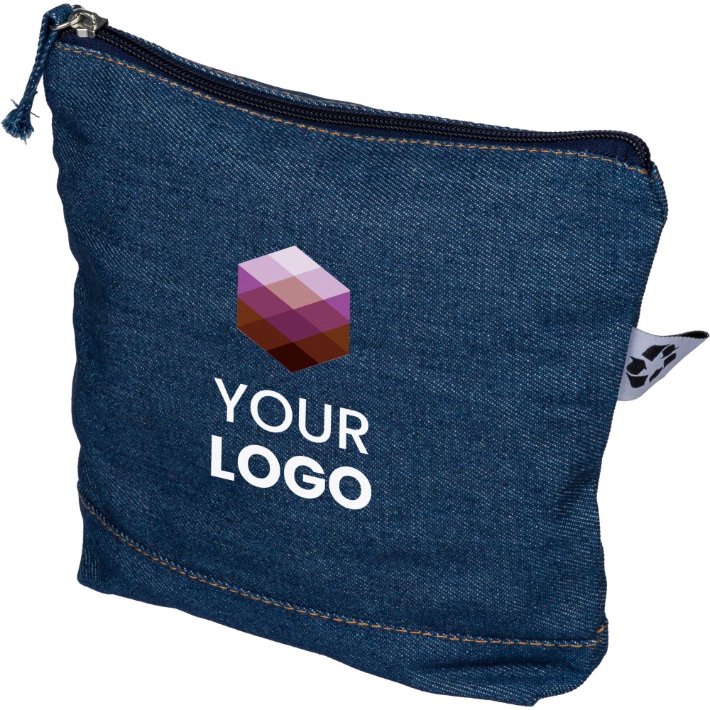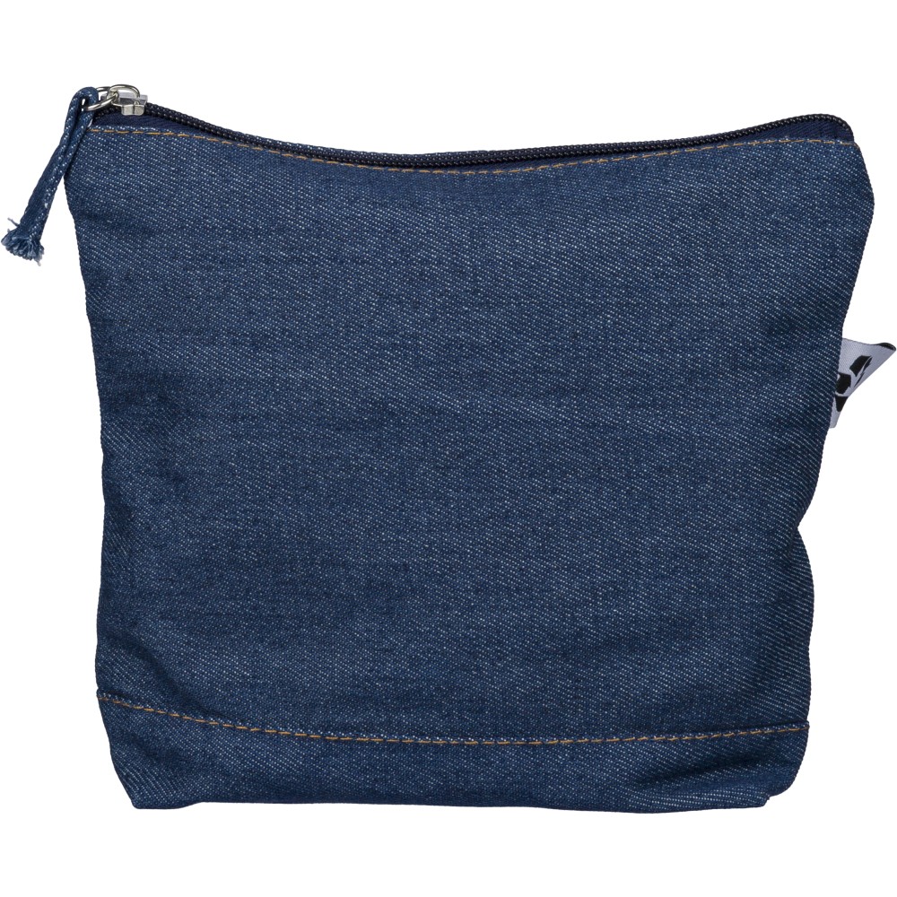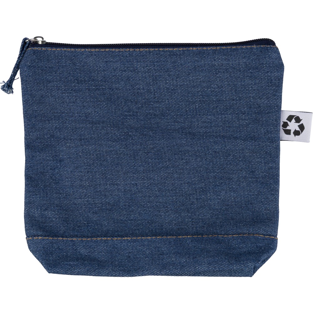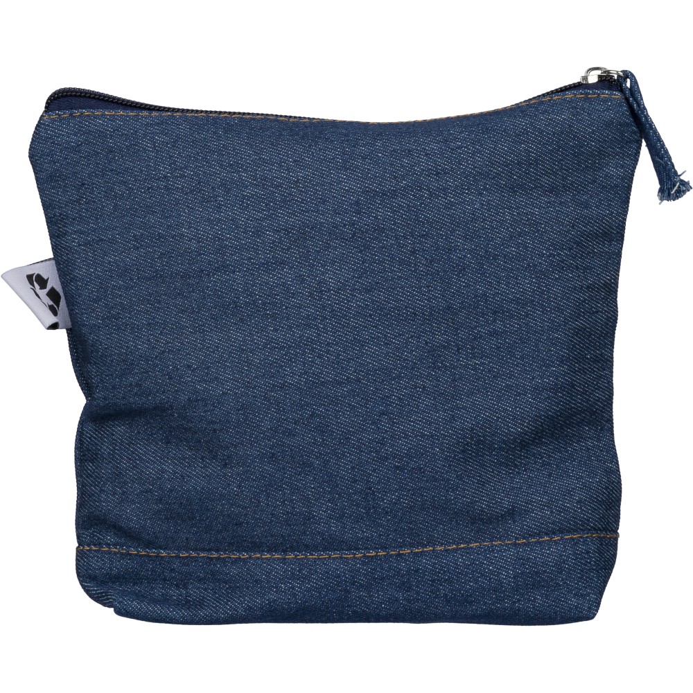 Újrahasznosított farmeranyagból készült kozmetikai táska 21 × 18,5 cm méretben, egy cipzáras fő rekesszel és a külső felületen elhelyezett újrahasznosított alapanyagra utaló címkével.