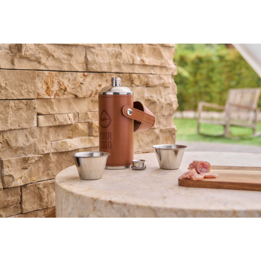 Kulacs két kupicával (40 ml) és külső PU borítással. 304-es rozsdamentes acélból készült. A poharak a tetején patenttal rögzíthetők. Egyenként barna kartondobozba csomagolva. Anyaga: újrahasznosított rozsdamentes acél. Űrtartalom: 230 ml.