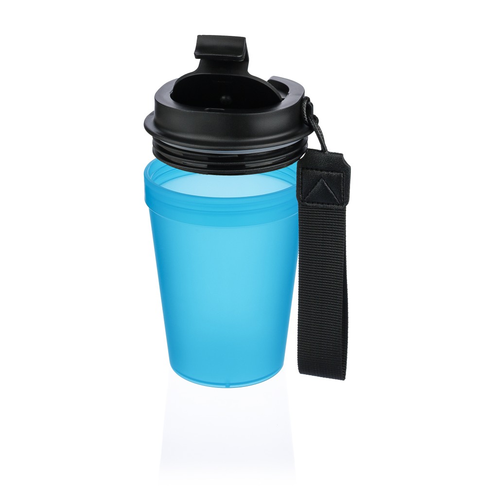 Átlátszó, szimplafalú ivópohár 350 ml-es űrtartalommal, vastagfalú kialakítással. Csavaros fedéllel és poliészter csuklópánttal rendelkezik a könnyű hordozhatóság érdekében. Tartós, ütésálló, megbízható termék. Meleg italokhoz is alkalmas, de kérjük, vegye figyelembe, hogy az egyfalú szerkezet miatt hőátadás előfordulhat.