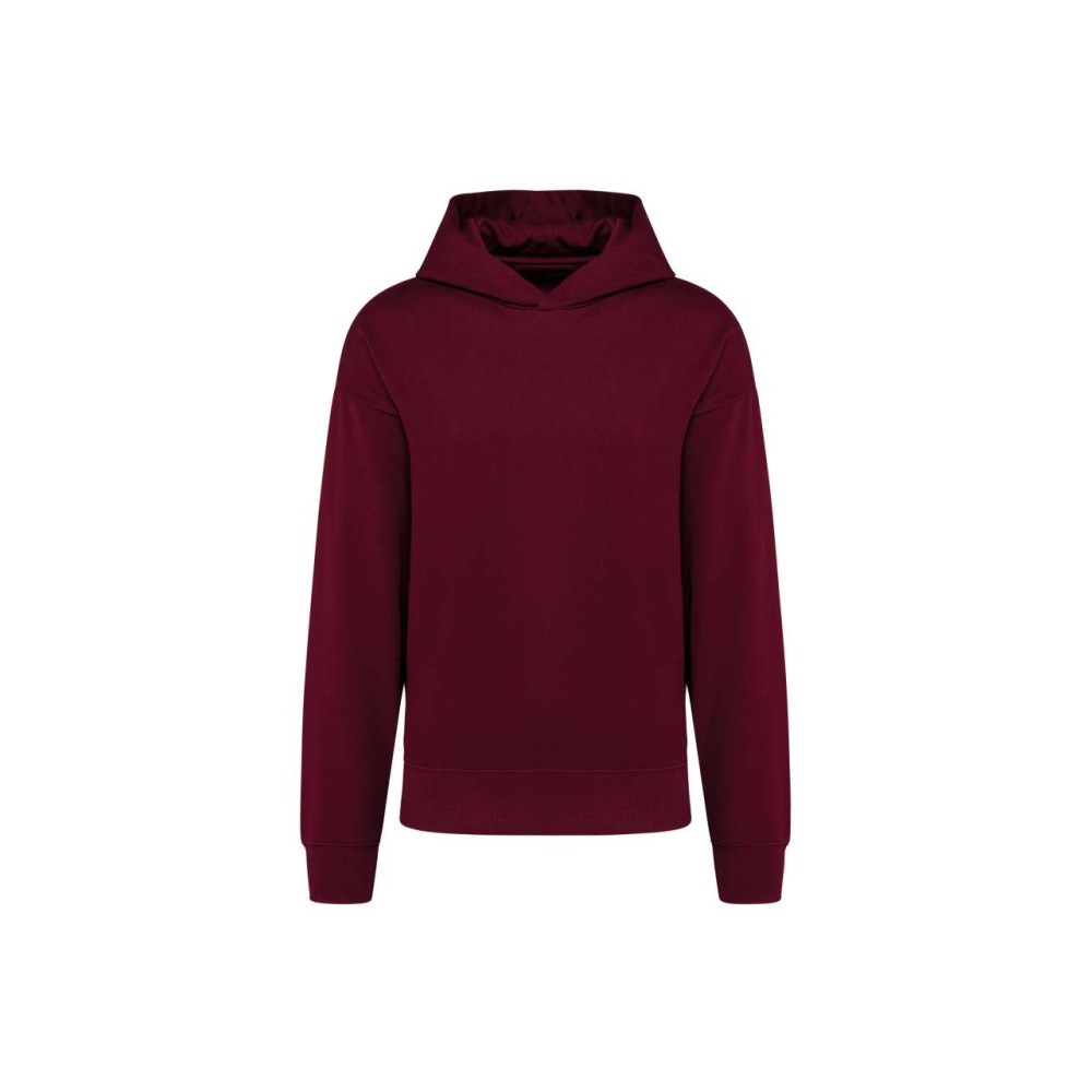 80% cotton / 20% polyester. Oversized fit with dropped shoulders. Brushed fleece. Carded cotton. 1x1 ribbing with a tubular finish on the cuffs and hem. Hidden pocket with invisible zip in the seam on the right side when worn. Cotton hood with double dart. Elastane in the ribbing on the cuffs and at the bottom of the garment to prevent them from going out of shape. Matching twill taped neck. Half-moon finish inside neck. Double overlaid overstitching on cuffs and bottom hem. No brand label on the collar. only a size tag for easy decoration.