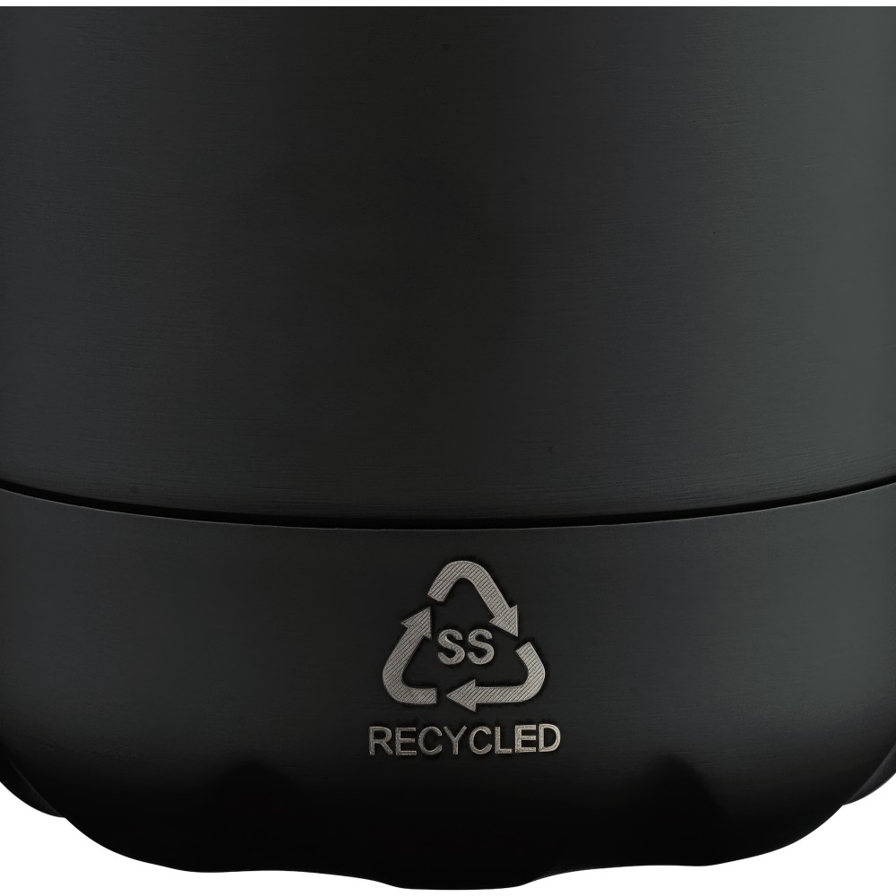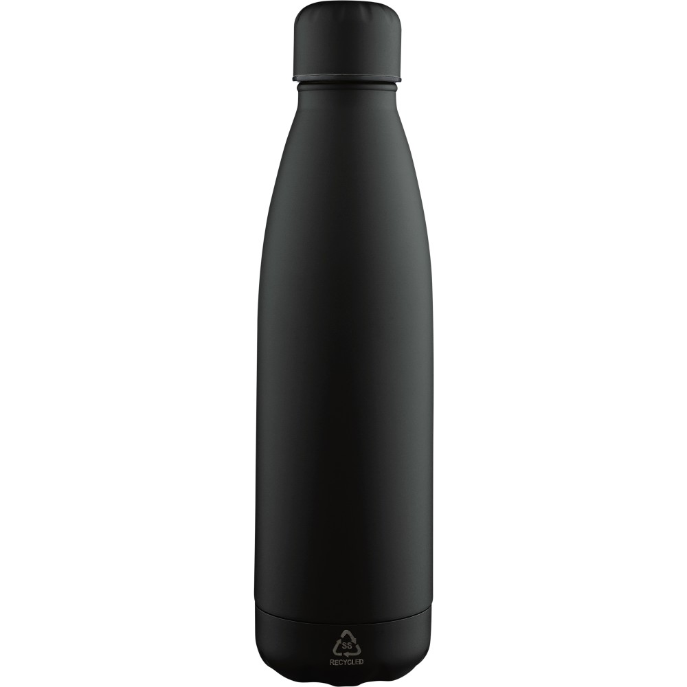Újrahasznosított rozsdamentes acél, egyfalú ivópalack 700 ml-es űrtartalommal. Hideg italok tárolására alkalmas, és 3-4 órán át hűvösen tartja azokat. A 304-es rozsdamentes acél belső kiváló tartósságot, rozsdaállóságot és biztonságos élelmiszer-érintkezést garantál. Matt színű felülettel, valamint színben illeszkedő csavaros fedéllel és aljjal. Az elülső oldalon gravírozott újrahasznosított logó található. Egyenként barna kartondobozba csomagolva.