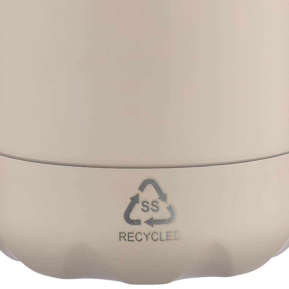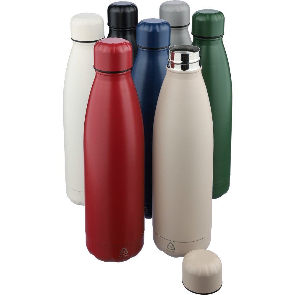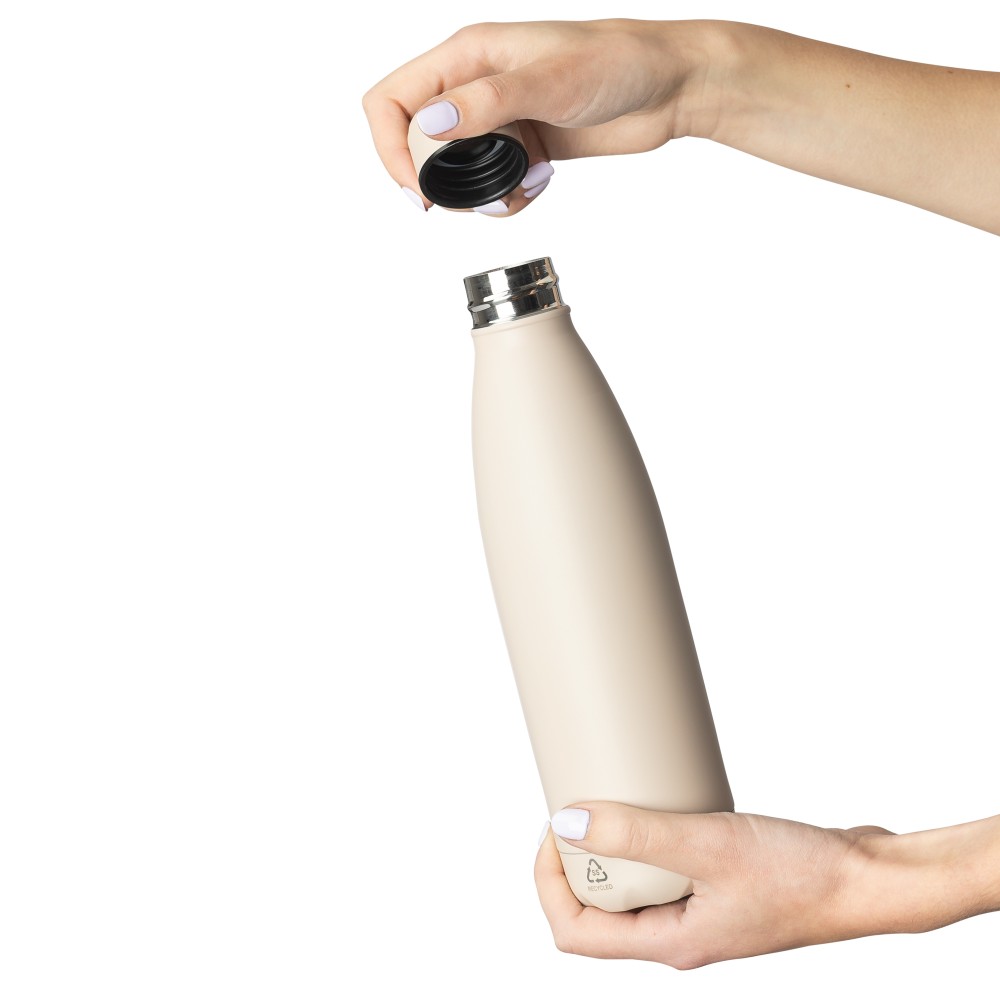 Újrahasznosított rozsdamentes acél, egyfalú ivópalack 700 ml-es űrtartalommal. Hideg italok tárolására alkalmas, és 3-4 órán át hűvösen tartja azokat. A 304-es rozsdamentes acél belső kiváló tartósságot, rozsdaállóságot és biztonságos élelmiszer-érintkezést garantál. Matt színű felülettel, valamint színben illeszkedő csavaros fedéllel és aljjal. Az elülső oldalon gravírozott újrahasznosított logó található. Egyenként barna kartondobozba csomagolva.